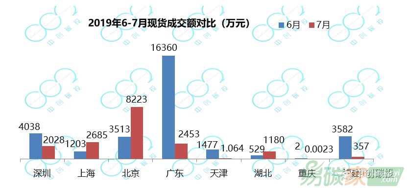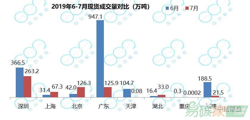 2019年7月,各二級市場共計(jì)成交量637.4萬噸,本月較6月(1697.0萬噸)下降了62.44%,當(dāng)月總成交額1.69億元,較6月(3.07億元)下降了45%。天津、重慶、廣東、深圳和福建于6月底基本截止履約, 7月份交易量較6月有明顯收緊。北京、湖北、上海