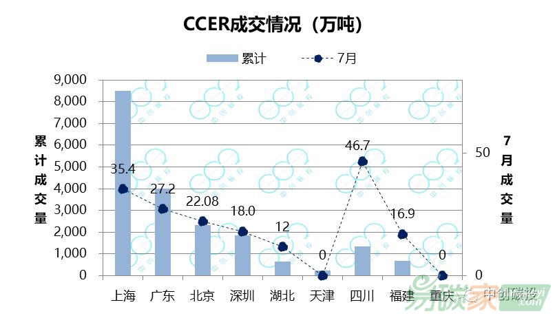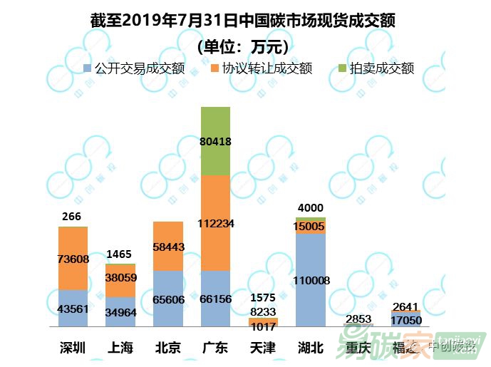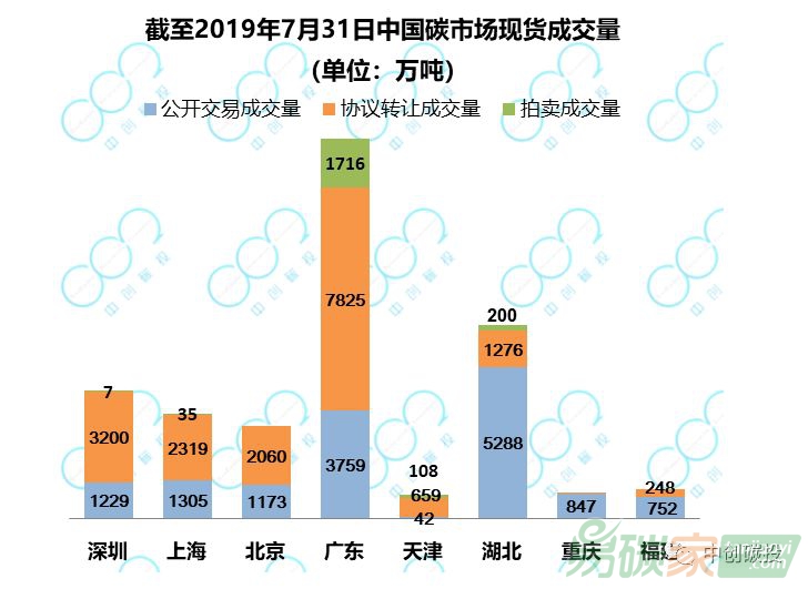截至2019年7月31日,9個(gè)備案的交易所共成交CCER1.95億噸,其中上海成交8502萬噸,占比約44%。7月,上海、廣東、北京、深圳、湖北、