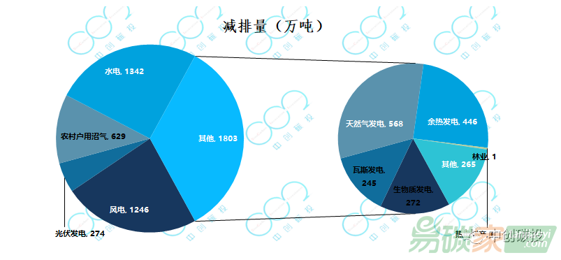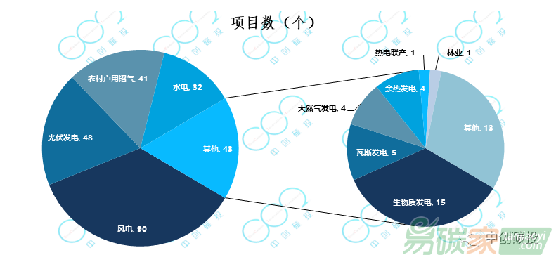 從項(xiàng)目類別看,已獲得減排量備案且材料公示的254個(gè)項(xiàng)目中,有第一類項(xiàng)目139個(gè),合計(jì)備案減排量1890萬噸CO2e;第二類項(xiàng)目17個(gè),備案減排量372萬噸CO2e;第三類項(xiàng)目98個(gè),備案減排量3031萬噸CO2e。從項(xiàng)目類型看,風(fēng)電、光伏、農(nóng)村戶用沼氣、水電等項(xiàng)目較多,詳細(xì)情況如下圖所示: