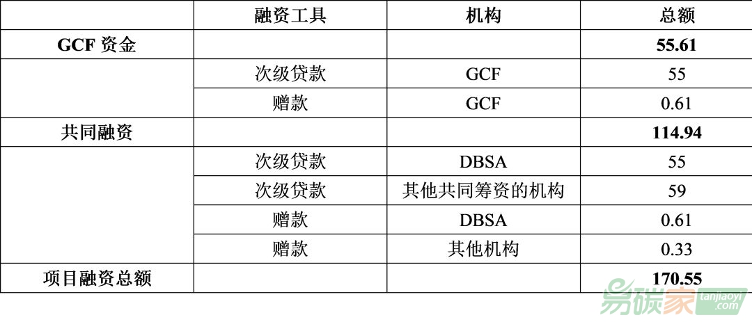 由DBSA實(shí)施的CFF項(xiàng)目將服務(wù)于非洲南部地區(qū),與私人資本合作,為低碳和氣候適應(yīng)性基礎(chǔ)設(shè)施項(xiàng)目提供資金,并促進(jìn)更多與氣候相關(guān)的投資。CFF將重點(diǎn)使用次級(jí)貸款、增信等金融工具,可延長(zhǎng)貸款期限或提供其他類型的信貸支持,以支持商業(yè)上可行但在私營(yíng)部門無(wú)法得到融資的項(xiàng)目。CFF的實(shí)施將降低風(fēng)險(xiǎn),增加氣候投資的可融資性,并吸引大量私營(yíng)部門資本。本項(xiàng)目的資金來(lái)源如下表所示: