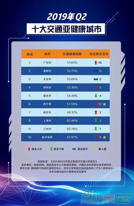 城市道路交通方面,在2019年二季度監(jiān)測的50個城市的交通健康指數(shù)排名來看,廣州交通健康指數(shù)最低,為51.83%,位居二季度城市交通亞健康榜單之首,其余排名前十城市分別為貴陽、北京、