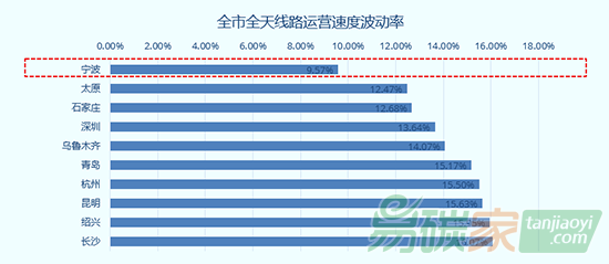 寧波全天線路運(yùn)營速度波動率最小在研究范圍內(nèi)的城市中、2019Q2期間,寧波全天線路運(yùn)營速度波動率最小,為9.57%,意味著城市地面公交的運(yùn)行效率最穩(wěn)定。一線城市中,深圳以13.64% 的“波動率”進(jìn)入榜單前十,意味著深圳在同體量城市中公交的運(yùn)行效率最穩(wěn)定。