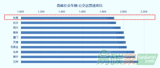 東莞高峰期公交速度與小汽車速度最接近此外,在研究范圍內(nèi)的城市中,二季度東莞市核心區(qū)內(nèi)的“高峰社會車輛-公交運(yùn)營速度比”最小,小汽車速度是公交的1.908倍與上季度基本一致。東莞、長沙、紹興3個城市的“速度比”小于2.000,這意味著,在高峰期、這些城市核心區(qū)內(nèi)的公交出行用時與小汽車的最接近。
