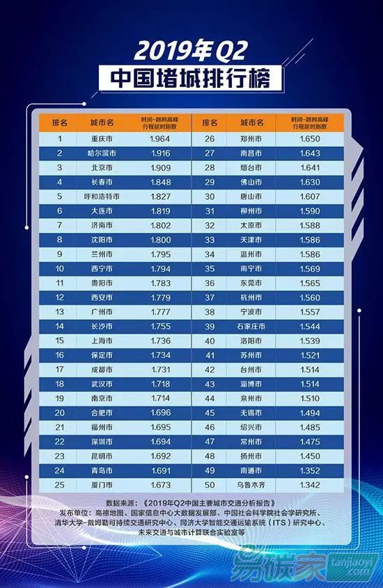 中國堵城排行榜發(fā)布 重慶再次居首根據(jù)高德地圖交通大數(shù)據(jù)監(jiān)測的50個主要城市結(jié)果顯示,2019Q2重慶路網(wǎng)高峰行程延時指數(shù)1.964,平均車速24.95km/h,高峰擁堵延時指數(shù)本季最高;本季十大堵城依次為重慶市、哈爾濱市、北京市、長春市、呼和浩特市、大連市、濟(jì)南市、沈陽市、蘭州市、西寧市,前十城市中9個位于北方。