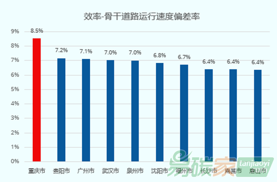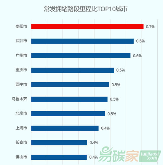 貴陽常發(fā)擁堵路段比例最高另外,在常發(fā)擁堵路段里程比指標(biāo)評價中,貴陽最高,其常發(fā)擁堵路段占比最高為0.7%,其次是深圳、廣州。從各城市最易常發(fā)擁堵路段的特點(diǎn)來看,常發(fā)擁堵多數(shù)道路都是因?yàn)榈缆妨髁窟^大與道路實(shí)際承載能力不能滿足有關(guān)。