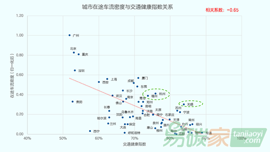 通過研究城市在途車流密度與交通健康指數(shù)的相關(guān)性發(fā)現(xiàn),在途車流密度超高的城市,交通健康指數(shù)普遍較低,例如廣州、北京、重慶、深圳,但也有個別城市存在差異,如無錫、福州、杭州雖然在途車流密度高,但交通健康指數(shù)相對較好。