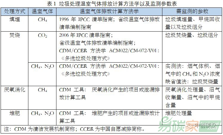 如何量化這些溫室氣體排放?根據(jù)《中國(guó)氣候變化第三次國(guó)家信息通報(bào)》和《中華人民共和國(guó)氣候變化第二次兩年更新報(bào)告》,2014年中國(guó)廢棄物領(lǐng)域的溫室氣體排放為1.95億tCO2e,涉及CO2、CH4和N2O三種溫室氣體。其中:垃圾填埋和焚燒處理產(chǎn)生的溫室氣體排放約1億tCO2e(填埋和焚燒排放比例分別為80%和20%),厭氧消化和堆肥等其他處理方式產(chǎn)生的排放并未包括在國(guó)家溫室氣體清單內(nèi)。不同垃圾處理方式產(chǎn)生的溫室氣體種類、溫室氣體排放計(jì)算方法以及監(jiān)測(cè)參數(shù)都不同,詳見表1: