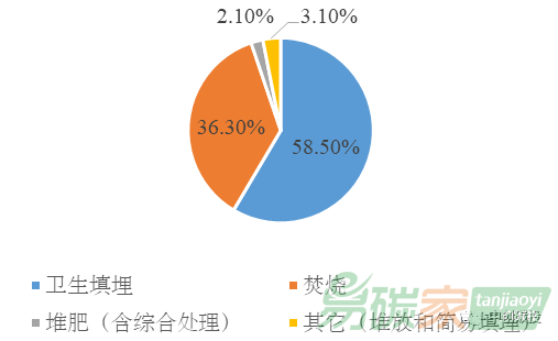 2016年,全國(guó)657個(gè)設(shè)市城市共有生活垃圾無(wú)害化處理廠940座,日處理能力62.1萬(wàn)噸,無(wú)害化處理量1.97億噸。處理方式以衛(wèi)生填埋和焚燒為主,堆肥和其它方式為輔,不同方式的處理比例如圖2所示:
