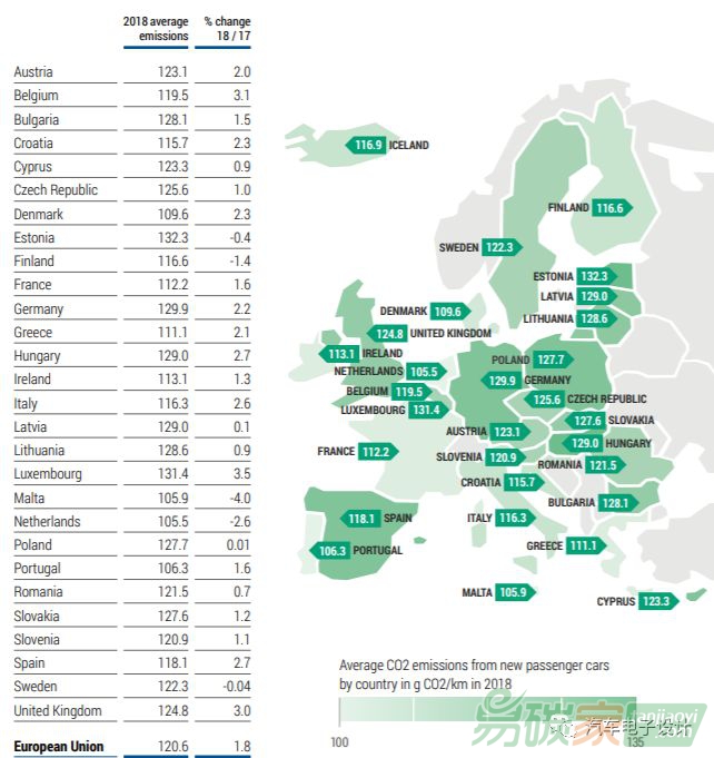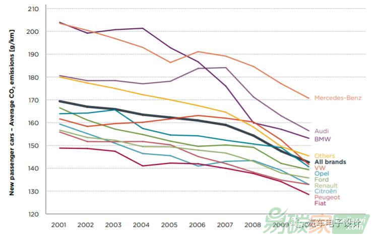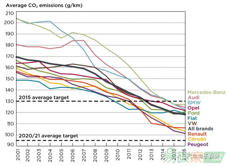 為了落實碳排放目標,歐盟在2009年頒布了首個針對新登記乘用車二氧化碳排放的強制性標準EU443/2009,要求到2015年乘用車碳排放應(yīng)降低至130g/kmCO2以下,超額部分將進行罰款。重罰之下,各個車企的重視程度是很大的,當時歐洲的策略主要是通過轉(zhuǎn)型柴油動力,2015年實際排放量為119.5g/km CO2。