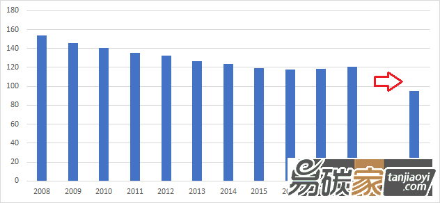 1998年歐盟第一次提出碳排放目標,計劃從1998年186g/km CO2降到2008年的140g/km CO2,2012年降至120g/km CO2。實際的情況,汽車企業(yè)當時還沒意識到這事真的重要,執(zhí)行層面不太好,2008年歐洲乘用車CO2排放量153.5g/km CO2。