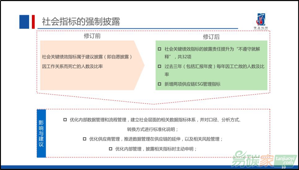 科學透明地優(yōu)化ESG管理。咨詢文件提出了多處修訂和量化披露有關(guān),即具體到具體數(shù)字,包括溫室氣體排放數(shù)據(jù)、能源耗用數(shù)據(jù)、工傷死亡數(shù)據(jù)。此外,ESG報告發(fā)布時間被壓縮,上市公司要同步制作財報和ESG報告,這意味著上市公司要建立更高效的ESG信息管理體系,如何科學透明地優(yōu)化ESG管理不可避免。