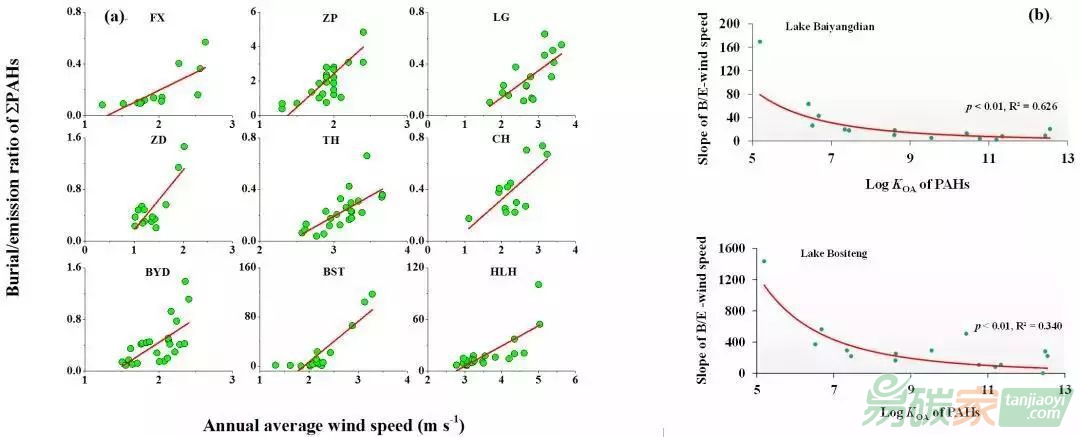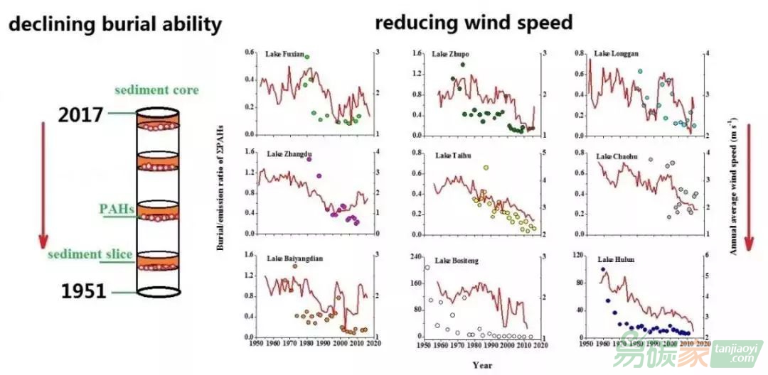 中國科學(xué)院南京地理與湖泊研究所副研究員陶玉強(qiáng)等以我國東北、西北、華北、西南、長江中游及長江下游9個(gè)典型湖泊(呼倫湖、博斯騰湖、白洋淀、撫仙湖、漲渡湖、朱婆湖、龍感湖、巢湖及太湖)及多環(huán)芳烴為例,通過沉積物巖芯中多環(huán)芳烴沉積通量、流域內(nèi)多環(huán)芳烴歷史排放通量、流域內(nèi)溫度、降雨量、降雨天數(shù)、風(fēng)速等歷史氣象參數(shù)、湖泊歷史水質(zhì)參數(shù)、湖泊有機(jī)碳埋藏通量等綜合分析,有效排除了富營養(yǎng)化和多環(huán)芳烴排放量對(duì)沉積物埋藏能力的影響,在國際上首次發(fā)現(xiàn)了在1951年至2017年期間氣候變化引起的地表風(fēng)速降低、氣溫升高及降雨天數(shù)減少已經(jīng)使中國湖泊對(duì)16種多環(huán)芳烴的埋藏能力降低了69.17% ± 9.37% - 85.69% ± 3.57%。