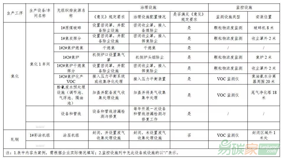 對(duì)全廠無(wú)組織排放源進(jìn)行全面排查,按照生產(chǎn)工藝過(guò)程、物料密閉儲(chǔ)存、物料密閉輸送、物料封閉儲(chǔ)存、物料封閉運(yùn)輸分別建立全覆蓋的無(wú)組織排放源清單,同時(shí)明確各排放源的治理和監(jiān)控措施。附表2-附表5為無(wú)組織排放源清單示例,可作為企業(yè)建立無(wú)組織清單的參考。