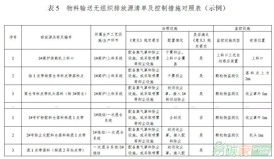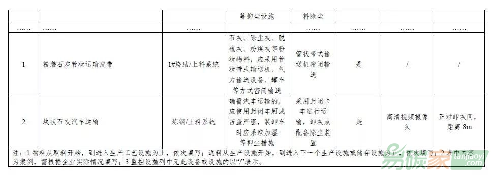 4.物料封閉運(yùn)輸清單。應(yīng)按照物料輸送線路從物料進(jìn)廠的上料運(yùn)輸起點(diǎn)到運(yùn)輸終點(diǎn)建立排放源清單,要說(shuō)明各排放源對(duì)應(yīng)所在的生產(chǎn)工藝及全廠管理區(qū)域,并且要明確各排放源的治理及監(jiān)測(cè)措施,同時(shí)明確治理措施的主要性能參數(shù)及監(jiān)測(cè)措施的安裝位置。