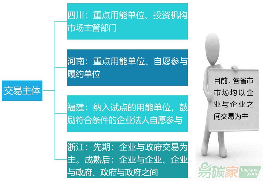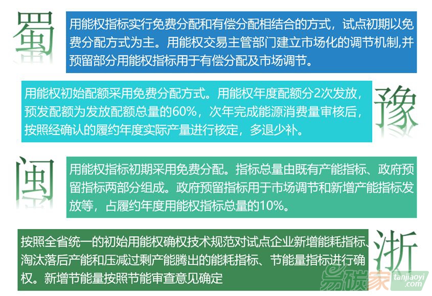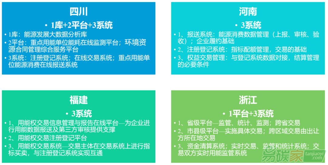試點(diǎn)省份對(duì)比分析目前四川、福建、浙江三個(gè)省份的用能權(quán)市場(chǎng)已經(jīng)正式開(kāi)市交易,河南的用能權(quán)市場(chǎng)也正在緊鑼密鼓的籌備中。在用能權(quán)市場(chǎng)的建設(shè)方面,各個(gè)省份由于經(jīng)濟(jì)、環(huán)境、產(chǎn)業(yè)結(jié)構(gòu)的不同,使得其建設(shè)的用能權(quán)市場(chǎng)在許多方面存在“地域特征”。下面將通過(guò)圖文對(duì)比的方式,使讀者能更加直觀清晰的對(duì)四個(gè)省份的用能權(quán)市場(chǎng)建設(shè)情況進(jìn)行了解。