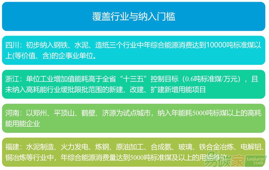 造紙三個(gè)行業(yè)中年綜合耗能10000噸標(biāo)煤以上的納入市場(chǎng)中,并后續(xù)逐步擴(kuò)大范圍。浙江將所有行業(yè)中除限定項(xiàng)目外單位工業(yè)增加值能耗大于0.6萬(wàn)噸標(biāo)準(zhǔn)煤每萬(wàn)元的企業(yè)全部納入用能權(quán)市場(chǎng)。福建市場(chǎng)則將八大行業(yè)中年均能耗超過(guò)5000萬(wàn)噸標(biāo)煤的企業(yè)納入。河南用能權(quán)市場(chǎng)建設(shè)與另外三個(gè)省市存在很大不同,其選取了鄭州、平頂山、鶴壁三市為試點(diǎn)城市,而非在全省范圍內(nèi)進(jìn)行建設(shè)。