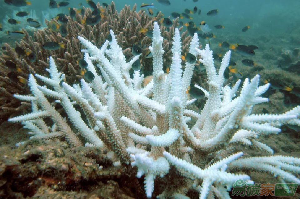 大規(guī)模的珊瑚白化是氣候變化引發(fā)的一個(gè)全球性問題。由于海洋熱浪持續(xù)時(shí)間越來越長,珊瑚不能承受長時(shí)間的高溫,開始死亡,珊瑚礁的多樣性因此逐漸減少。自2016年以來,大堡礁的一半珊瑚已經(jīng)被漂白致死。大堡礁的黯然失色說明了海水升溫破壞的范圍有多廣:2016年30%的珊瑚死亡,2017年為20%。沿礁北岸的大部分海洋生態(tài)系統(tǒng)變得貧瘠,幾乎沒有恢復(fù)的希望[10]。