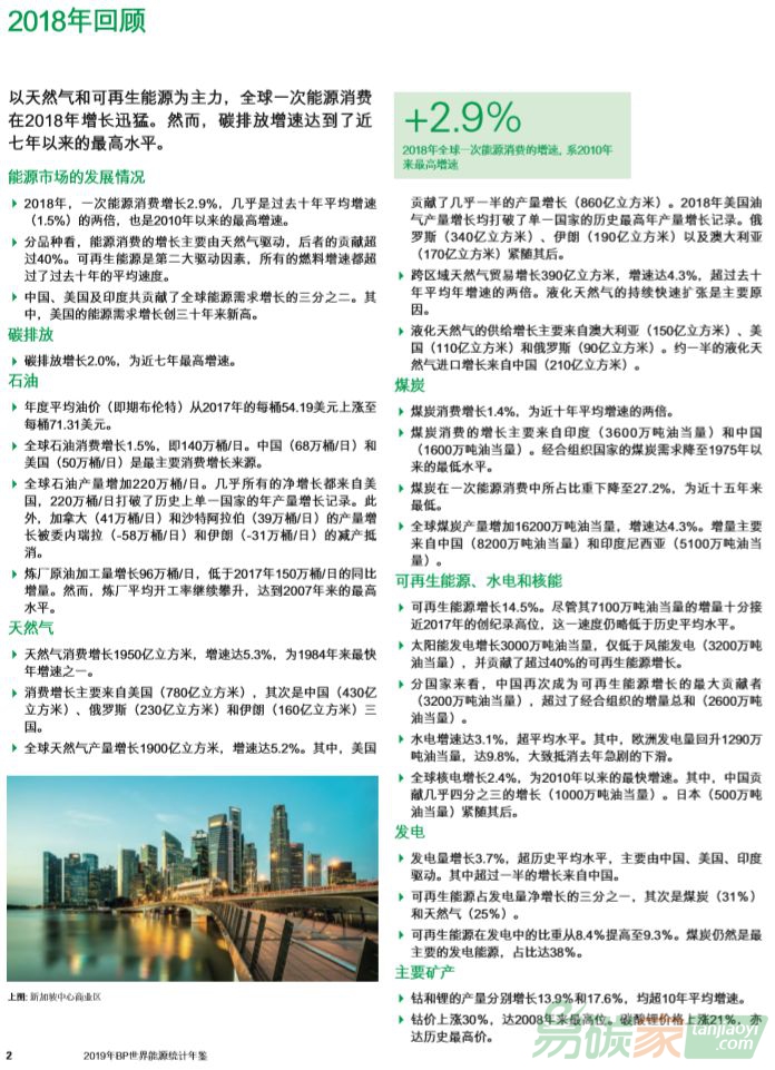幾乎所有能源種類增長都很強勁,且增速都超過了其近期歷史平均水平,尤其是天然氣。在2018年,天然氣的增速達到5.3%,是近三十年來的最快增速之一,貢獻了45%的全球能源增長。經(jīng)過三年的下降后,煤炭需求(1.4%)迎來了連續(xù)第二年的增長??稍偕茉矗?4.5%)的增長相較以往有所放緩,但目前仍是增速最快的能源資源。