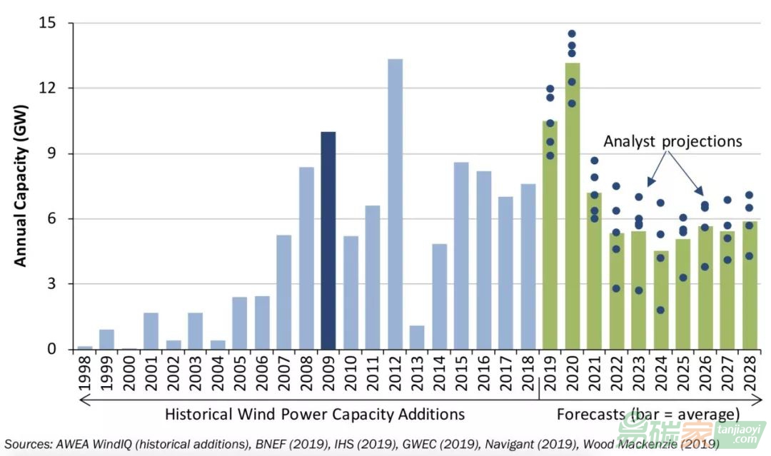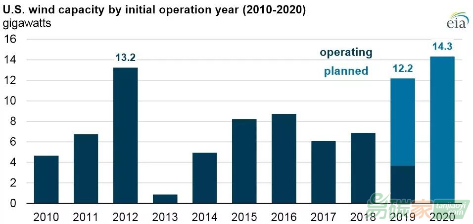 近期,根據(jù)EIA(美國能源信息署)的預(yù)測,2019年,美國風(fēng)電新增裝機(jī)容量將達(dá)到12.2GW(2019年上半年新增3.7GW,下半年還將新增8.5GW); 2020年,美國風(fēng)電新增裝機(jī)容量將達(dá)到14.3GW,超過2012年13.2GW的風(fēng)電新增裝機(jī)容量。
