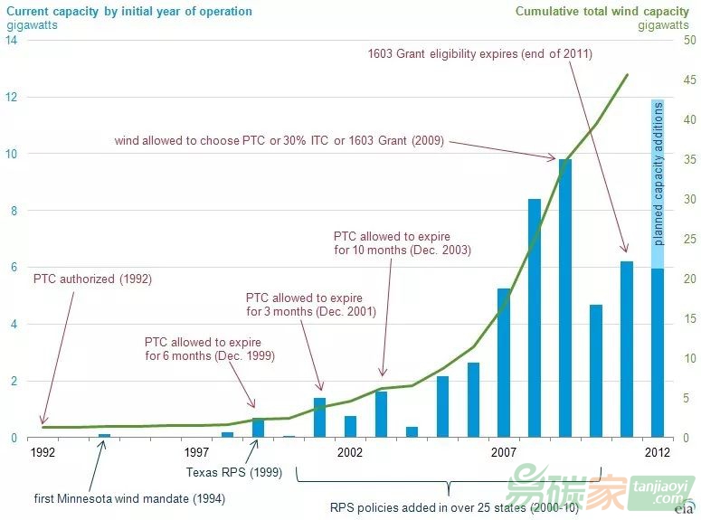 EIA指出,美國新增風(fēng)電裝機(jī)容量的變化與稅收激勵機(jī)制有關(guān)。美國現(xiàn)行的風(fēng)電生產(chǎn)稅抵免