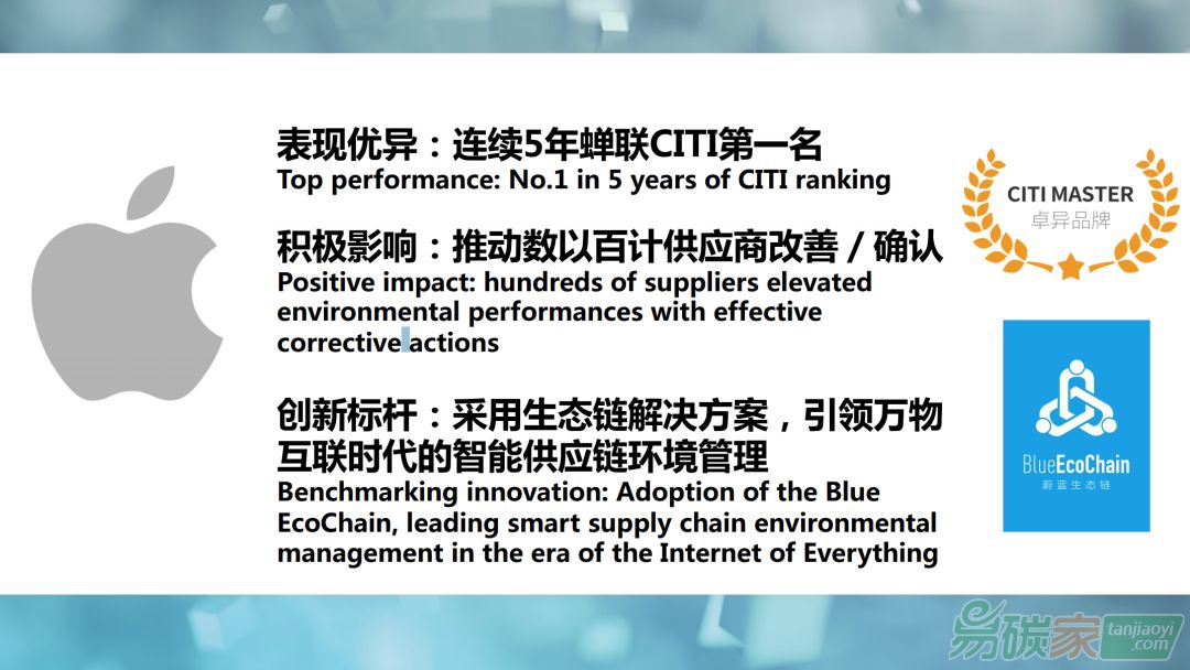 蘋果成為首個(gè)入選 “CITI卓異品牌”榜單的公司,該榜單的設(shè)立旨在推動(dòng)品牌在供應(yīng)鏈環(huán)境管理中與供應(yīng)商構(gòu)建更平等的伙伴關(guān)系,推動(dòng)供應(yīng)商更主動(dòng)地承擔(dān)污染治理的主體責(zé)任。