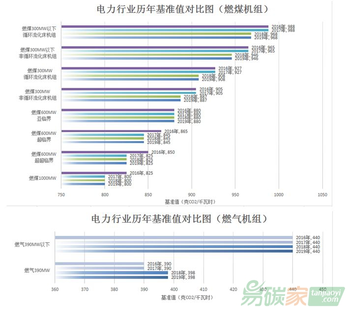電力行業(yè)2019年度,增設(shè)了分布式燃料熱電聯(lián)產(chǎn)機(jī)組基準(zhǔn)線。同時(shí)對(duì)特殊燃料發(fā)電機(jī)組給予明確定義,即摻燒燃料燃燒排放占機(jī)組全部排放比例不小于10%。歷年基準(zhǔn)值對(duì)比如下: