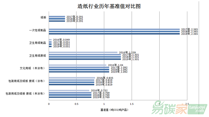 2019年度造紙行業(yè)配額分配基準(zhǔn)線基準(zhǔn)值較2018年度沒(méi)有變化,歷年基準(zhǔn)值對(duì)比如下: