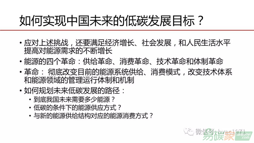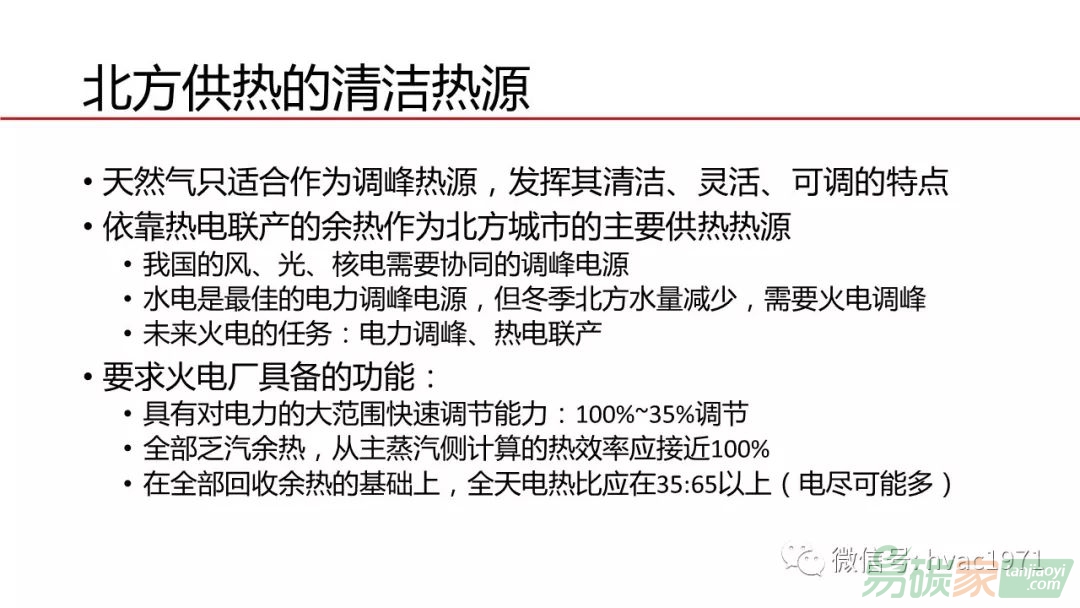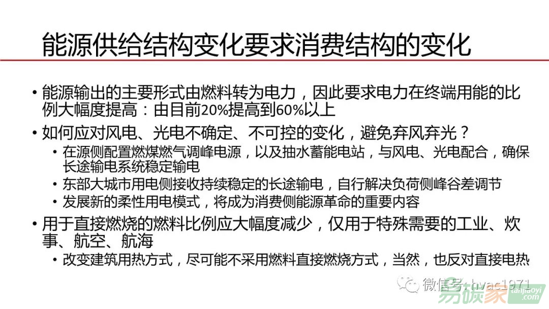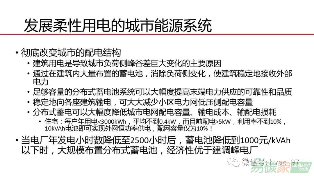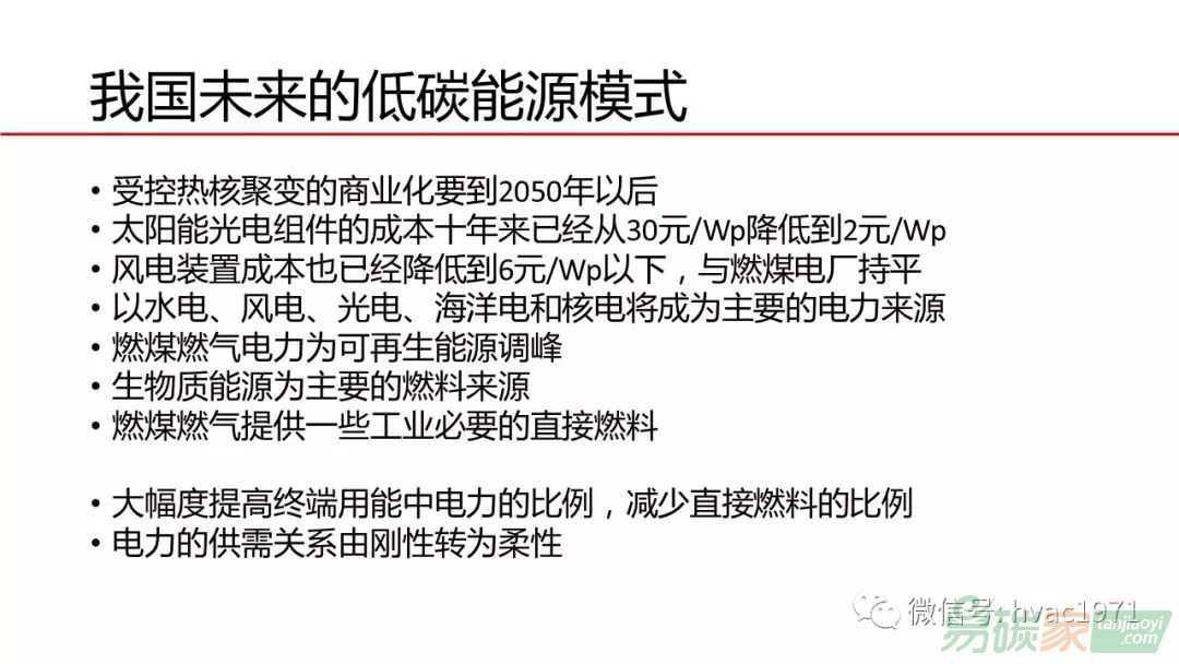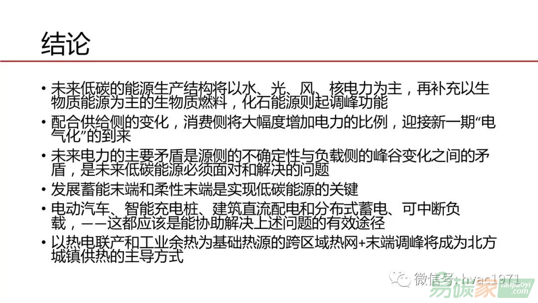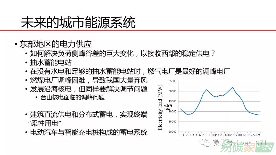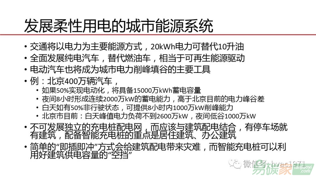 問題。發(fā)展蓄能末端和柔性末端是實現(xiàn)低碳能源的關鍵,電動汽車、智能充電樁、建筑直流配電和分布式蓄電、可中斷負載——這都應該是能協(xié)助解決上述問題的有效途徑。以熱電聯(lián)產(chǎn)和工業(yè)余熱為基礎熱源的跨區(qū)域熱網(wǎng)+末端調(diào)峰將成為北方城鎮(zhèn)供熱的主導方式。