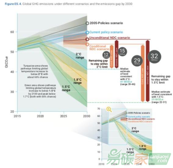 《報(bào)告》提出,如希望控溫在2攝氏度,2030年的排放量需要比目前的NDCs減少150億噸二氧化碳排放;為了達(dá)到控溫1.5攝氏度的目標(biāo),則需要減排320億噸。因此,為達(dá)到1.5攝氏度控溫目標(biāo),各方的NDC減排目標(biāo)必須至少提高五倍,若為達(dá)到2攝氏度控溫目標(biāo),則最少提高三倍。