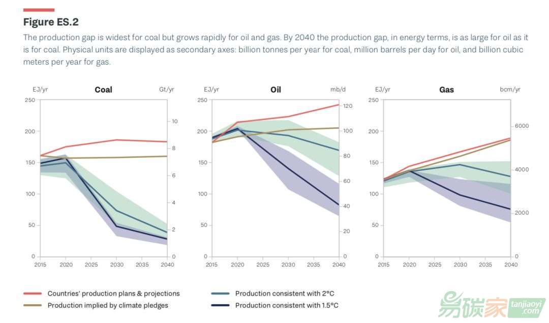 ——在化石燃料中超產(chǎn)最大的是煤炭,到2030年各國計劃生產(chǎn)的煤炭量將比2°C要求高出150%(52億噸),比1.5°C要求高出280%(64億噸)。相對于1.5°C溫升要求,石油生產(chǎn)超出59%或4200萬桶/天;天然氣超出70%或2萬億立方米。