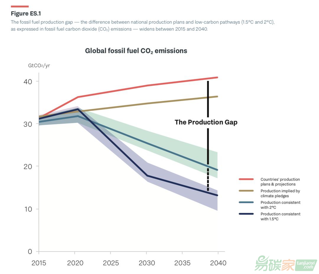 ——總體而言,各國計劃到2030年的化石燃料生產(chǎn)將導(dǎo)致排放390億噸的二氧化碳(GtCO2)。這比2°C溫升要求高出130億噸,即53%;比1.5°C溫升要求要高出210億噸。到2040年這一差距將進一步擴大。
