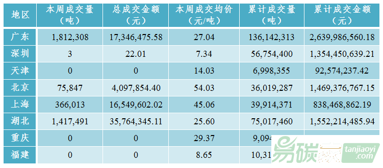 福建碳市場、重慶碳市場、天津碳市場本周未成交。