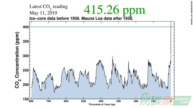圖2. 近80萬年以來大氣CO2濃度的變化:1958年前數(shù)據(jù)來自于冰芯數(shù)據(jù),之后的數(shù)據(jù)來自于夏威夷Mauna Loa觀測站。圖自Scripps海洋研究所。
