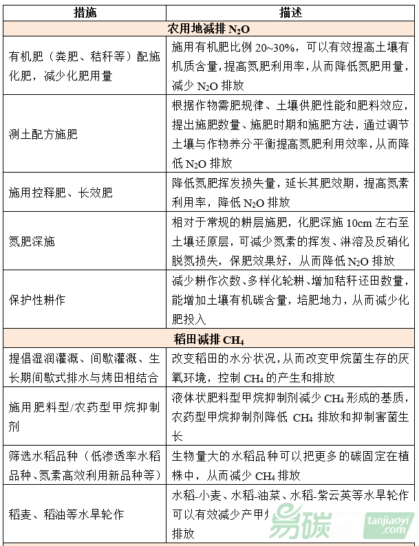 相關(guān)研究根據(jù)上述不同種類(lèi)溫室氣體的排放因子計(jì)算了在不同情景下農(nóng)業(yè)源溫室氣體減排技術(shù)潛力,其中減排技術(shù)潛力較高的措施分別為耕地管理(含旱地和水田)、牧場(chǎng)管理、土壤養(yǎng)分管理、退化耕地恢復(fù)。根據(jù)上述減排潛力較高的措施,具體到農(nóng)業(yè)生產(chǎn)活動(dòng)中,主要的減排技術(shù)見(jiàn)表1。