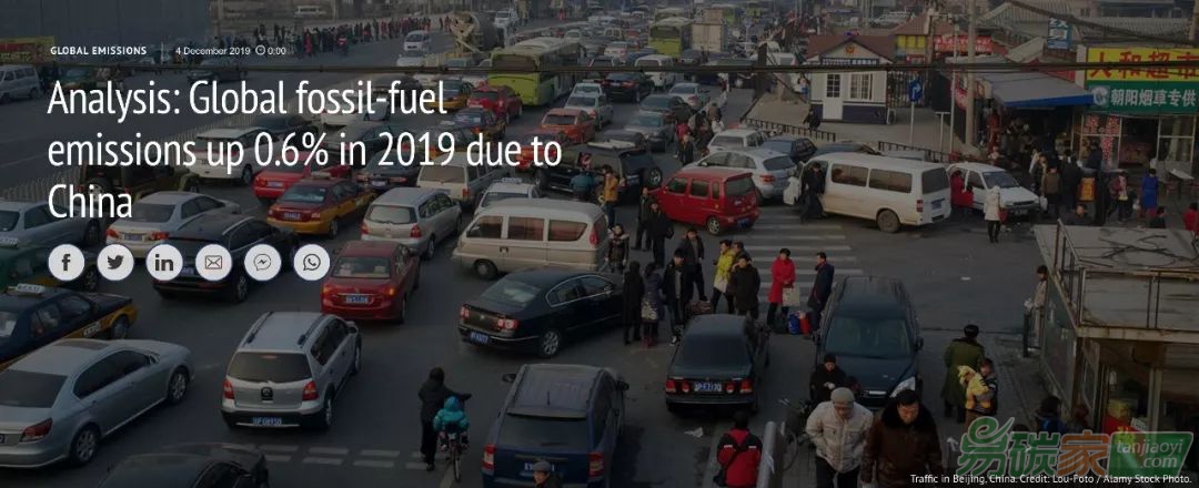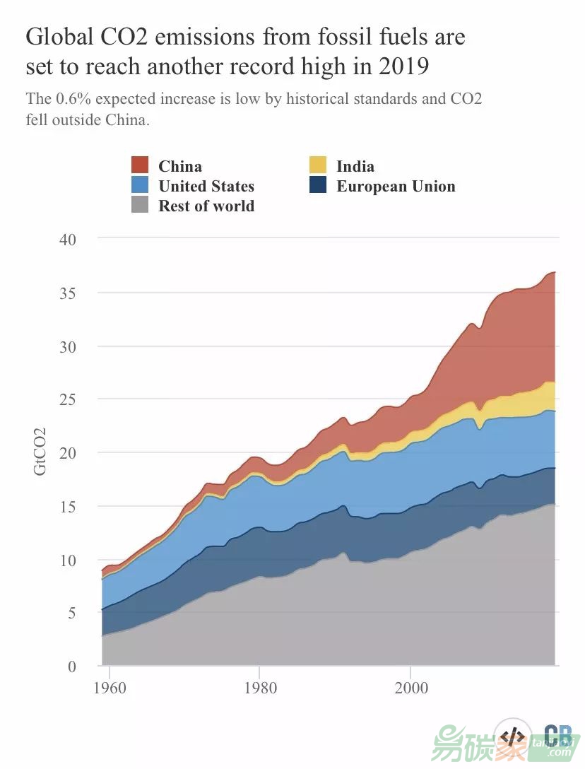 根據(jù)Global Carbon Program(GCP)的最新估計(jì),2019年全球化石燃料和工業(yè)(FF&I)的排放量將達(dá)到368.1億噸二氧化碳,僅比2018年的水平僅增加2.4億噸(+0.6%) 。而2019年全球排放量的增長(zhǎng)基本完全來(lái)自于中國(guó),中國(guó)的二氧化