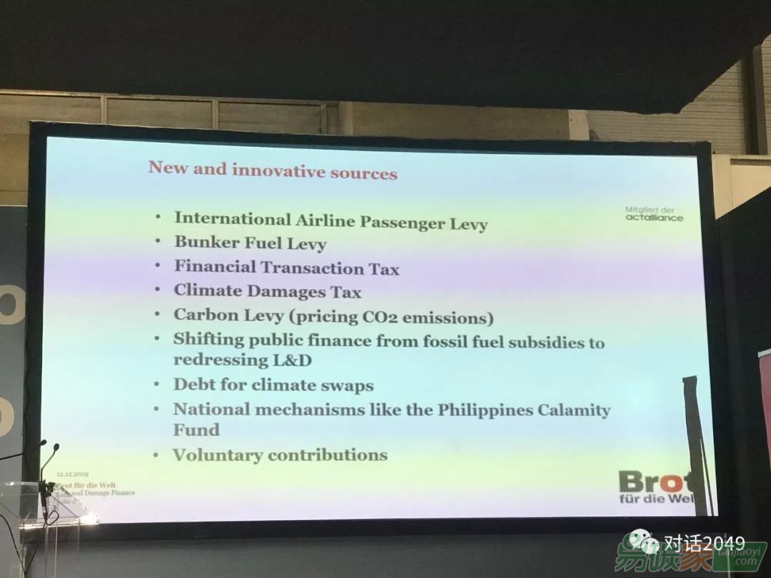 說(shuō)到底還是資金的問(wèn)題。12月12日一場(chǎng)主題為“開(kāi)拓新疆土:加速損失與損害的治理和資金機(jī)制”的邊會(huì)就是探討氣候適應(yīng)資金如何解決,以及如何花好的問(wèn)題。NGO組織“世界的面包”(Bread for the world)的氣候政策顧問(wèn)Sabine Minninger女士說(shuō):“德國(guó)捐給氣候基金的錢,沒(méi)有一分錢花在了損失和損害上?!?nbsp;她提出了多元化氣候適應(yīng)基金的渠道,包括國(guó)際航班旅客稅、燃油稅、氣候損害稅、碳稅等手段。