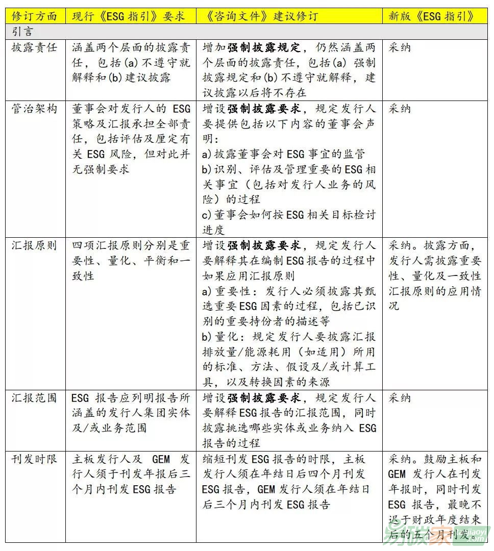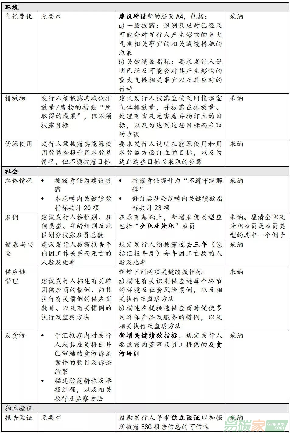 在綜合考慮回應(yīng)人士的意見(jiàn)后,聯(lián)交所針對(duì)《咨詢文件》中的部分建議描述做了調(diào)整,但總體來(lái)說(shuō),《咨詢文件》中的各項(xiàng)修訂建議最后在新版《ESG指引》中均得到了采納。具體如下: