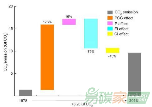 碳排放變化驅(qū)動(dòng)力。研究者在分析中國(guó)改革開(kāi)放40年來(lái)的數(shù)據(jù)后發(fā)現(xiàn),人口增長(zhǎng)率、人均GDP、能源強(qiáng)度和