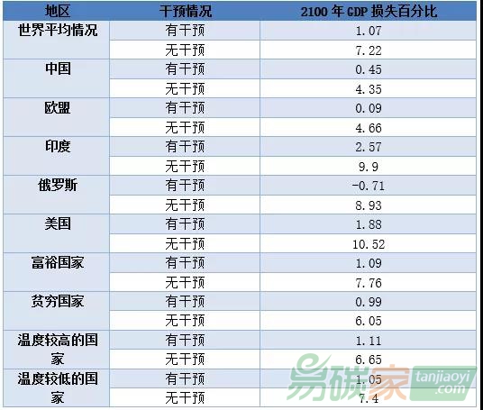 表1:在有干預(yù)或無干預(yù)的情況下各國人均GDP損失的百分比