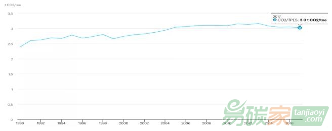 圖2: 中國能源系統(tǒng)的碳排放強(qiáng)度1990-2017,單位:tCO2/toe