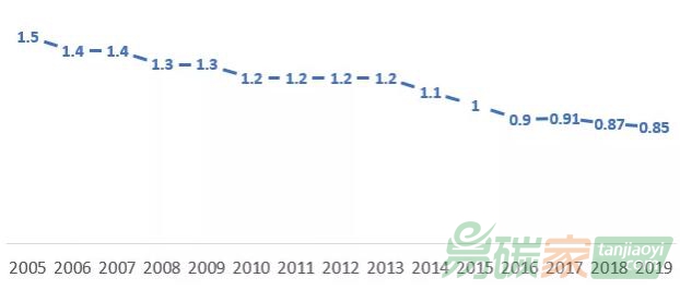 圖1:2005-2019中國單位GDP碳排放強(qiáng)度(單位:千克CO2/2010年不變價美元)