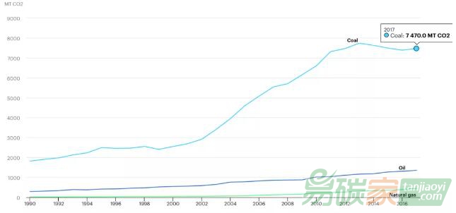 圖3:中國不同能源消費(fèi)所對應(yīng)的碳排放1990-2017