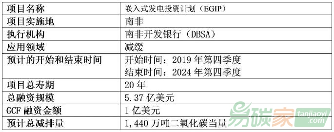 GCF-DBSA嵌入式發(fā)電[2]投資計(jì)劃(EGIP)是綠色氣候基金(GCF)在南非支持的一個(gè)項(xiàng)目(GCF網(wǎng)站項(xiàng)目號(hào):106)。該計(jì)劃將支持實(shí)施330MW的可再生能源項(xiàng)目,其中包括280MW光伏發(fā)電和50MW風(fēng)電。該計(jì)劃將通過兩個(gè)部分實(shí)現(xiàn),第一部分將為私營(yíng)部門太陽能和風(fēng)能獨(dú)立發(fā)電企業(yè)提供信貸支持,這些企業(yè)是由非主權(quán)承保人支持的特殊目的載體,目的是增強(qiáng)此類可再生能源項(xiàng)目的可融資能力。第二部分將為當(dāng)?shù)厣鐓^(qū)信托基金(LCTs)和/或中小微企業(yè)(SMMEs)設(shè)立和擁有的特殊目的公司提供支持,以支持這些特殊目的公司獲得和管理當(dāng)?shù)乜稍偕茉错?xiàng)目的股權(quán)。