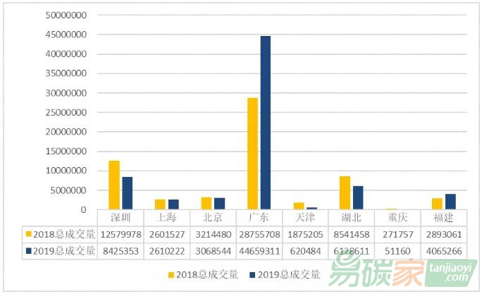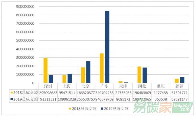 從各試點前后年度的成交數(shù)據(jù)對比來看,廣東碳市場在2019年比上一年度在成交總量和總額上均有了大幅提升,增長速度明顯快于其他試點。