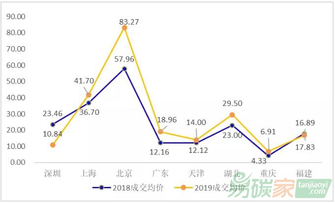 深圳碳市場2019年比上一年度有了明顯的交易額下滑,一方面是由交易總量下降導(dǎo)致,更大原因是配額的成交均價比2018年減少了一倍有余。其余碳市場兩年度成交情況差異不大,試點碳市場平穩(wěn)運行。