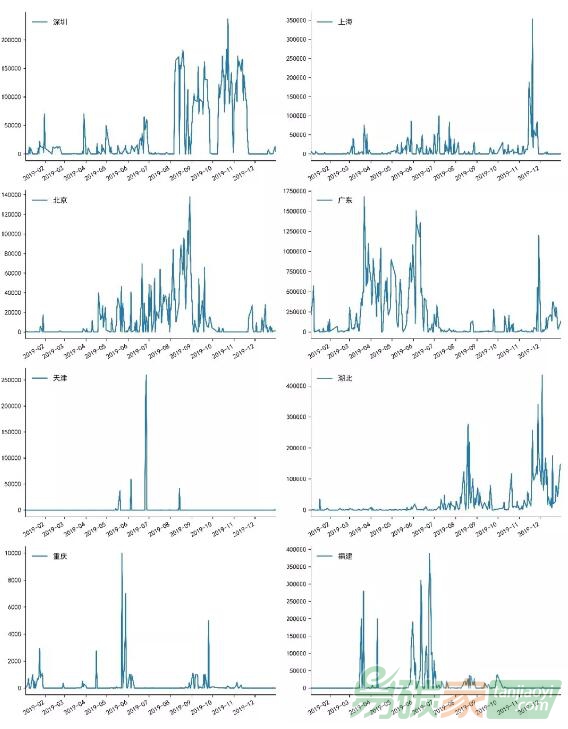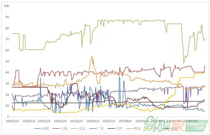 從各碳市場的日交易數(shù)據(jù)看,廣東和湖北碳市場交易較活躍,全年分別有5個和6個交易日無交易。但個別碳市場交易不活躍,全年僅有12個交易日有成交記錄,且在履約期前后達到峰值,其余幾日交易量都不大。也有的碳市場雖然有交易,但交易量極小,某些天數(shù)的交易數(shù)量甚至只有1噸。各試點2019年度的交易量如圖6所示,可看出各試點碳配額交易具有明顯的峰谷特性,高峰一般出現(xiàn)在各地履約期前后,而由于配額交易活躍度不高,通常都有多個跨度較大的低谷。