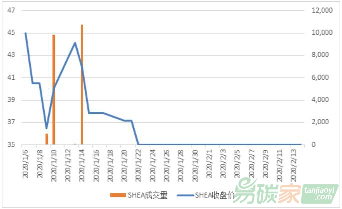 2020/2/10-2020/2/14,上海碳配額(SHEA)現(xiàn)貨線上及協(xié)議轉(zhuǎn)讓均無成交。受疫情影響,本周是上海碳市場春節(jié)延遲開市后首周,由于大部分控排企業(yè)仍在有序復(fù)工復(fù)產(chǎn)過程中,且無明顯碳市場相關(guān)政策沖擊,參與機(jī)構(gòu)多在觀望,SHEA未有交易達(dá)成,價格維持春節(jié)前最后一個交易日收盤價35.03元/噸不變。