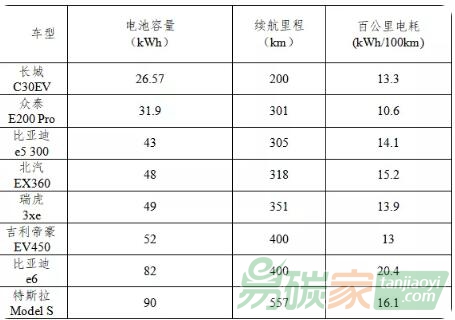 我們再來看看電動汽車?yán)m(xù)航里程及百公里電耗: