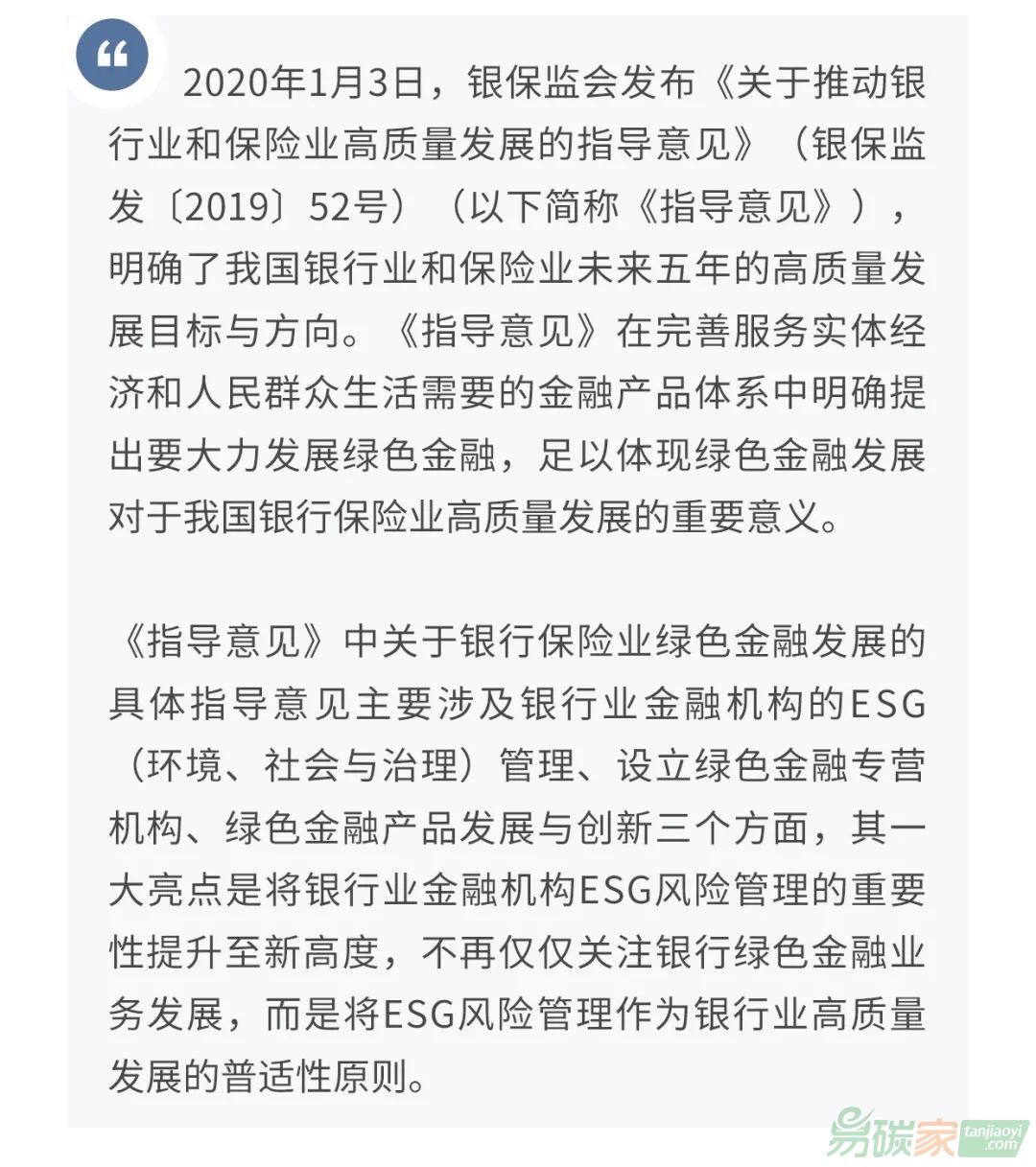 其中,《指導(dǎo)意見(jiàn)》在完善服務(wù)實(shí)體經(jīng)濟(jì)和人民群眾生活需要的金融產(chǎn)品體系中明確提出要大力發(fā)展綠色金融,足以體現(xiàn)綠色金融發(fā)展對(duì)于我國(guó)銀行保險(xiǎn)業(yè)高質(zhì)量發(fā)展的重要意義?!吨笇?dǎo)意見(jiàn)》中關(guān)于銀行保險(xiǎn)業(yè)綠色金融發(fā)展的具體指導(dǎo)意見(jiàn)主要涉及銀行業(yè)金融機(jī)構(gòu)的ESG(環(huán)境、社會(huì)與治理)管理、設(shè)立綠色金融專營(yíng)機(jī)構(gòu)、綠色金融產(chǎn)品發(fā)展與創(chuàng)新三個(gè)方面,其一大亮點(diǎn)是將銀行業(yè)金融機(jī)構(gòu)ESG風(fēng)險(xiǎn)管理的重要性提升至新高度,不再僅僅關(guān)注銀行綠色金融業(yè)務(wù)發(fā)展,而是將ESG管理作為銀行業(yè)高質(zhì)量發(fā)展的普適性原則。
