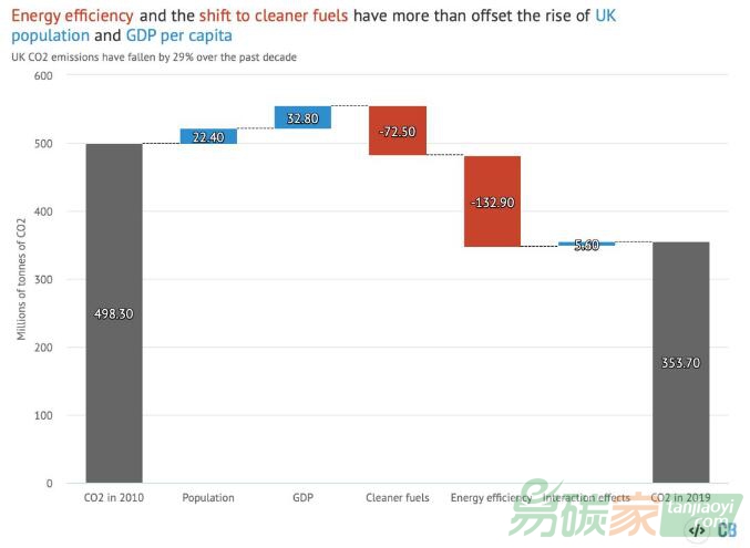 英國(guó)二氧化碳排放的下降主要靠能效的提高和低碳能源替代。與2010年(碳排放4.98億噸)相比,因?yàn)槿丝谠黾訉?dǎo)致碳排放增加2240萬(wàn)噸、經(jīng)濟(jì)增長(zhǎng)導(dǎo)致碳排放3280萬(wàn)噸,而低碳能源替代導(dǎo)致碳排放下降7250億噸,而能效的提高導(dǎo)致碳排放下降高達(dá)1.33億噸。